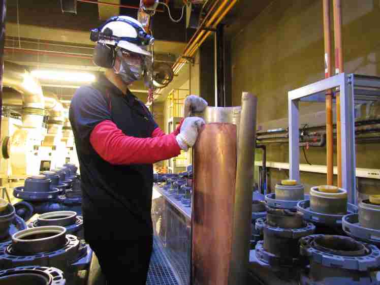 冰球突破将废弃物转化成有效的工业或民生原物料,,图为废铜液淬炼后再制成纯度极高的铜管
