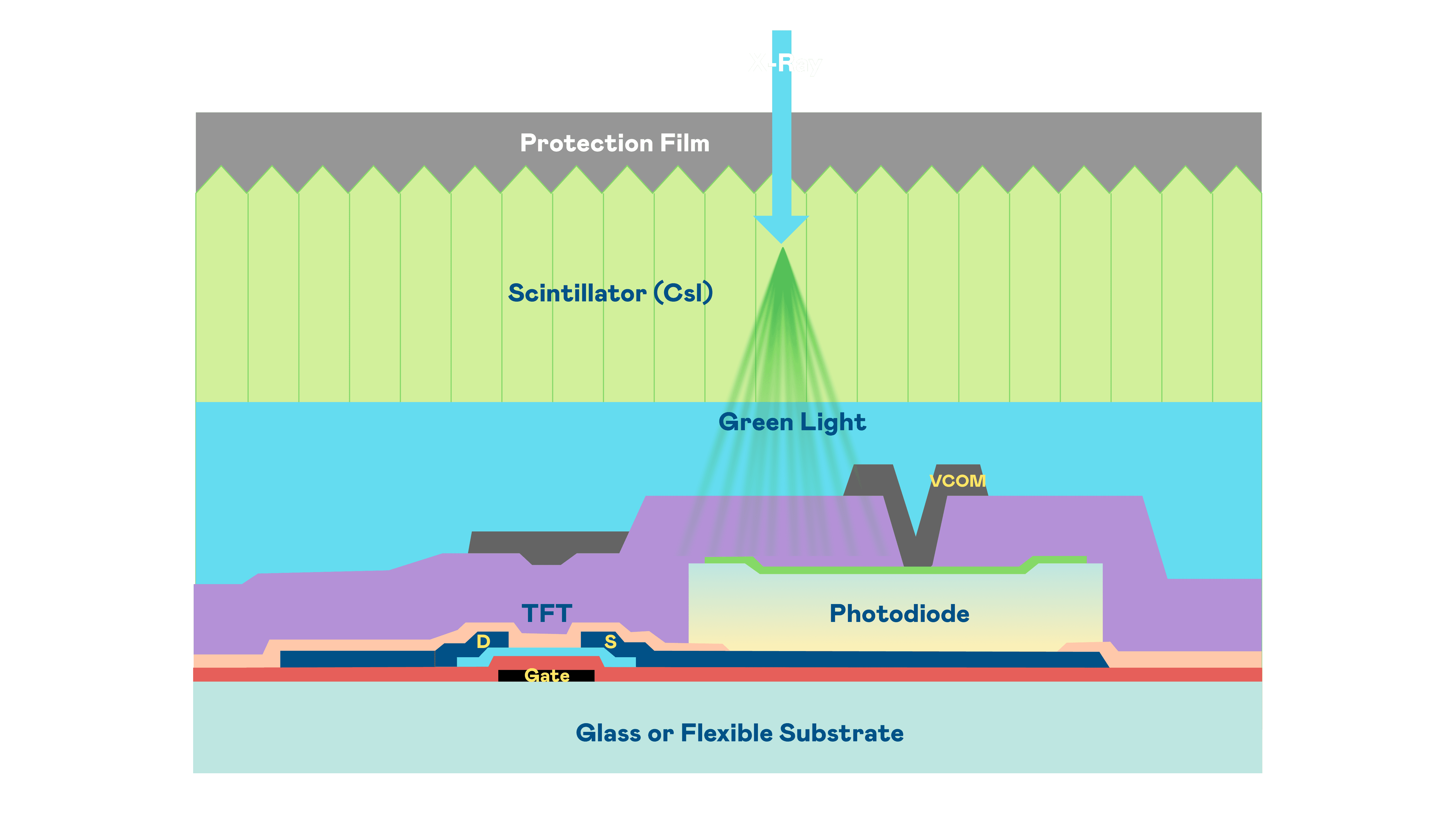 冰球突破的X光影像感测阵列使用薄膜电晶体 (TFT) 作为每个像素的读取开关,,,搭配光电二极体(Photodiode)的光电转换元件,,用以感测X光影像讯号。。。。