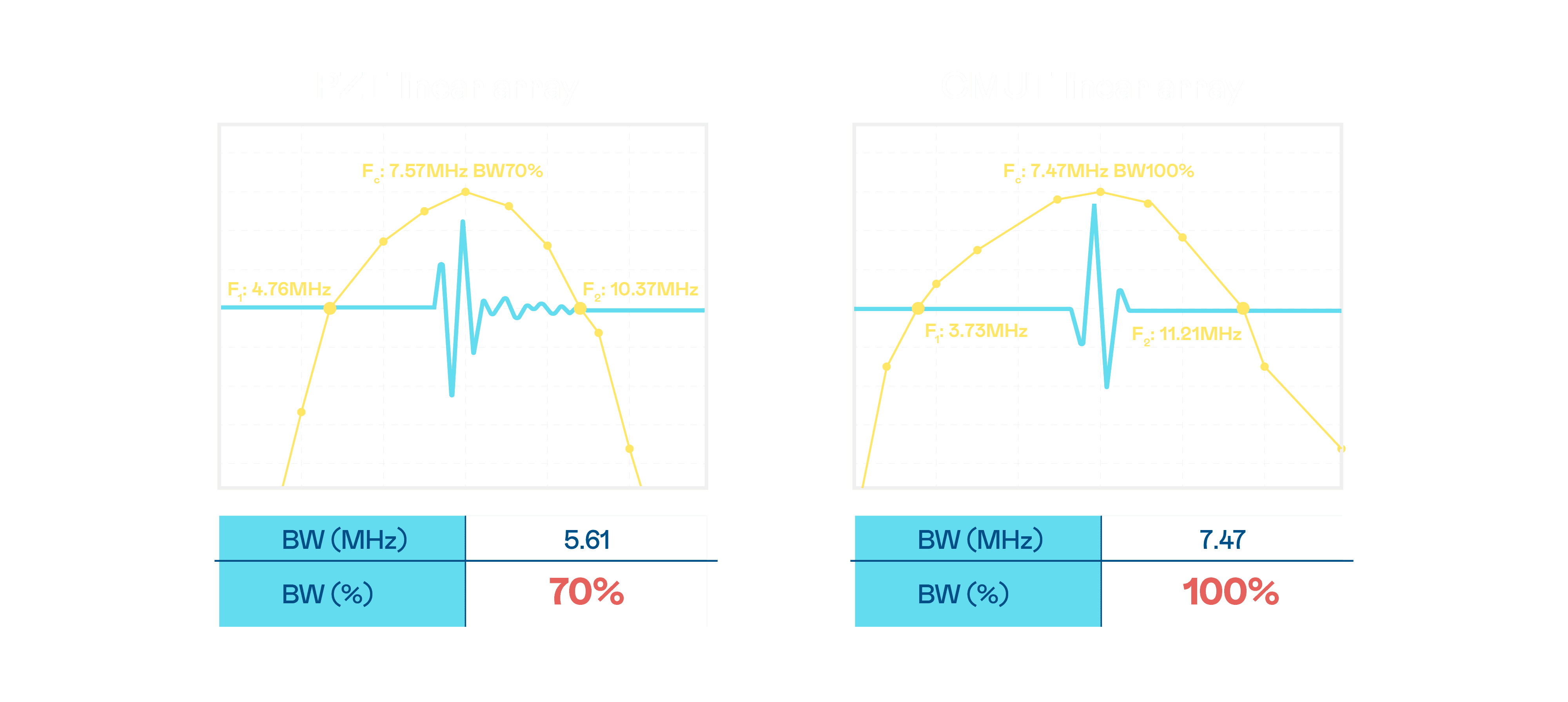 超音波影像的解析度高低,,首先取决于探头能发出的讯号频宽。。。冰球突破 CMUT 可提供高清晰的超音波讯号,,,,提供高频宽、、高灵敏度、、影像纹理细节更高的超音波影像,,协助医护人员缩短影像判读时间及利用精准的医疗影像进行诊断。。。。